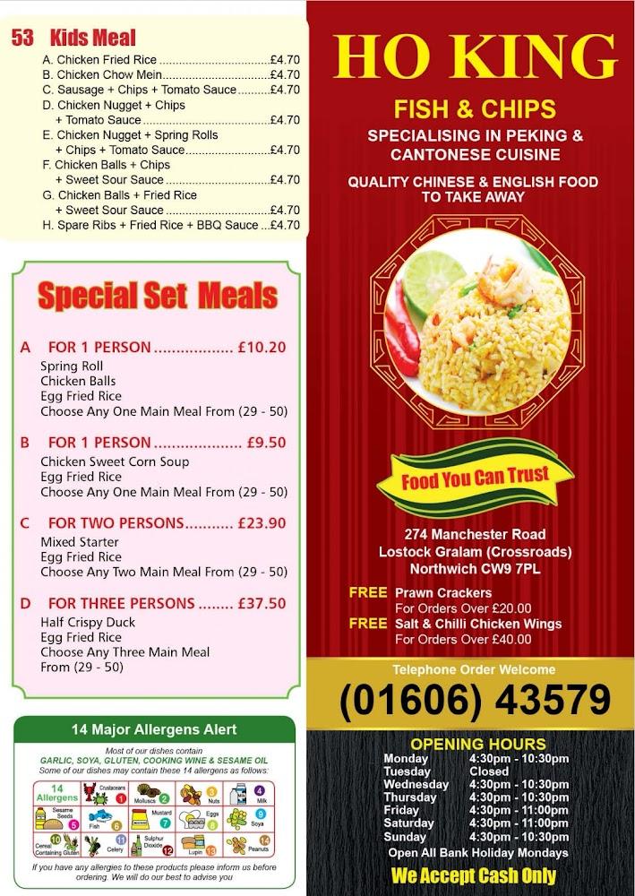 Located at 274 Manchester Road in Lostock Gralam, Northwich, Ho King is a beloved local takeaway that attracts diners with its tempting Chinese dishes and classic fish and chips. This hidden gem doesn’t just serve food; it creates an experience. With wheelchair-accessible facilities and free street parking, it accommodates everyone. Entering Ho King, the casual yet inviting atmosphere offers a few seats for those waiting to collect their orders. The staff is known for their exceptional friendliness, adding a personal touch that makes every visit enjoyable.